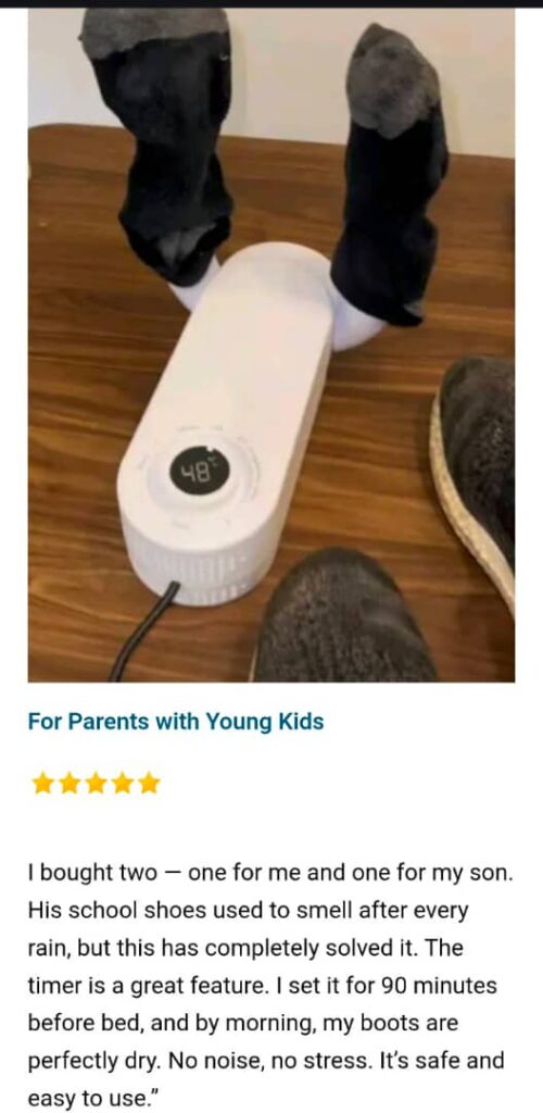 “Compact and works anywhere!” “I travel a lot for work, and carrying wet or damp shoes was always a problem. Shoe Oxidry fits easily in my bag, and I use it in hotels whenever it rains. It’s powerful, fast, and keeps all my shoes odor-free. Worth every naira.” — Martha K., Lagos